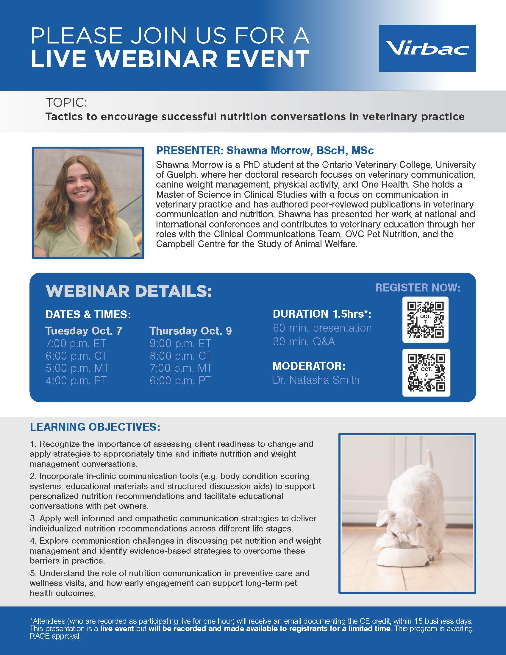 Shawna Morrow is a PhD student at the Ontario Veterinary College, University of Guelph, where her doctoral research focuses on veterinary communication, canine weight management, physical activity, and One Health. She holds a Master of Science in Clinical Studies with a focus on communication in veterinary practice and has authored peer-reviewed publications in veterinary communication and nutrition. Shawna has presented her work at national and international conferences and contributes to veterinary education through her roles with the Clinical Communications Team, OVC Pet Nutrition, and the Campbell Centre for the Study of Animal Welfare.
